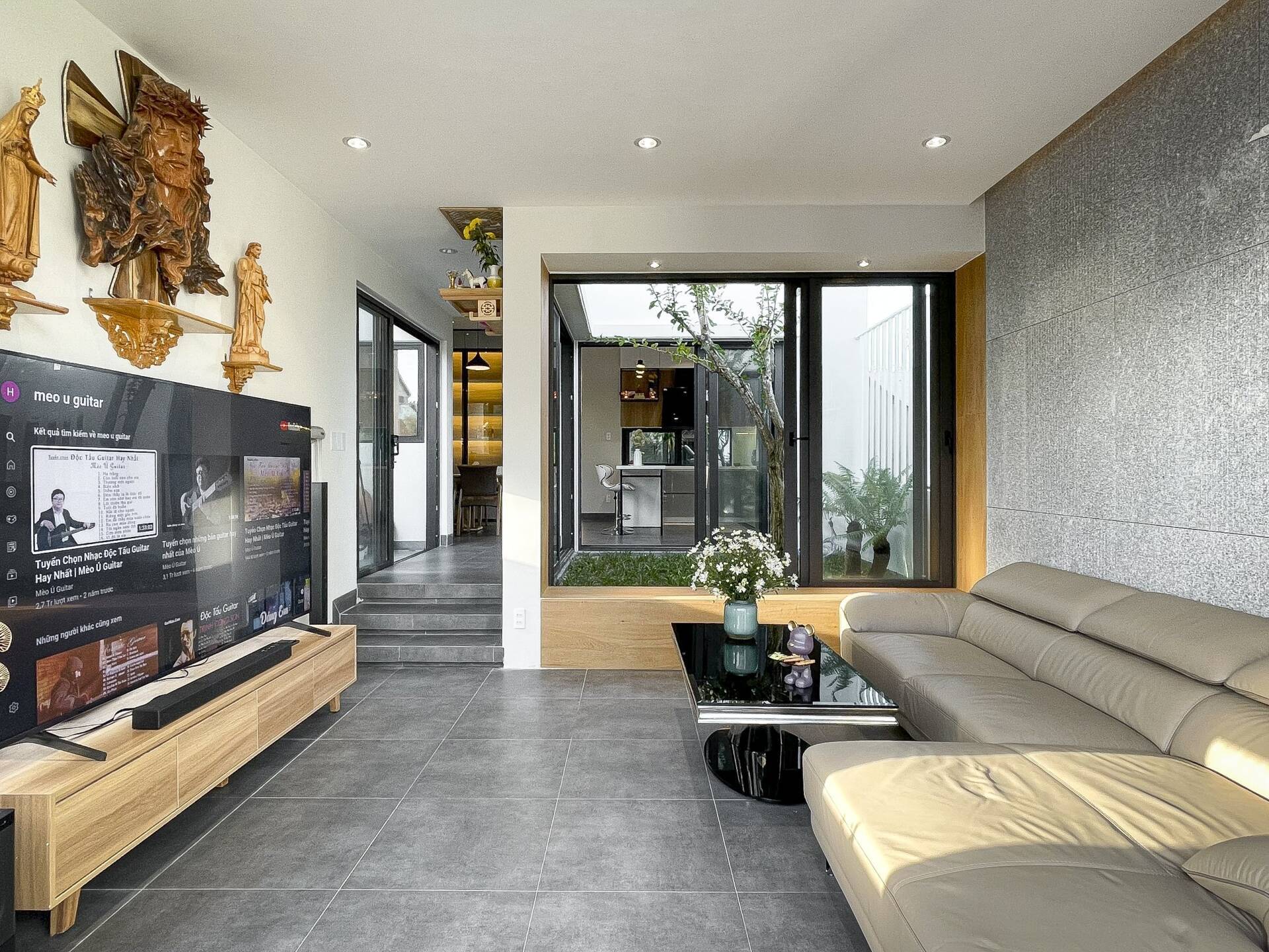 Phòng khách phong cách hiện đại của nhà cấp 4 nhìn thông thoáng nhờ sử dụng đồ nội thất đơn giản, màu tông màu trung tính (Ảnh: Hằng House)