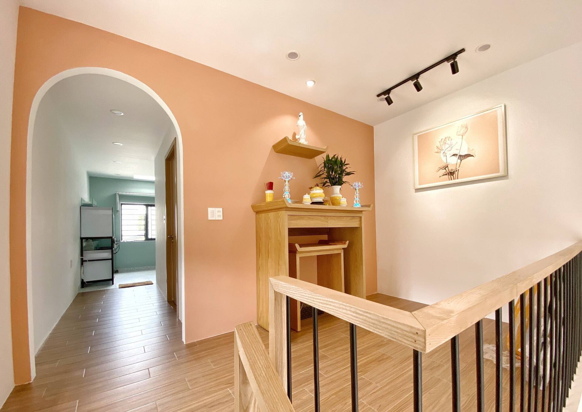 Gian thờ đặt trên gác lửng vừa lịch sự vừa yên tĩnh, trang nghiêm (Ảnh: Nhà 4,6x14m)
