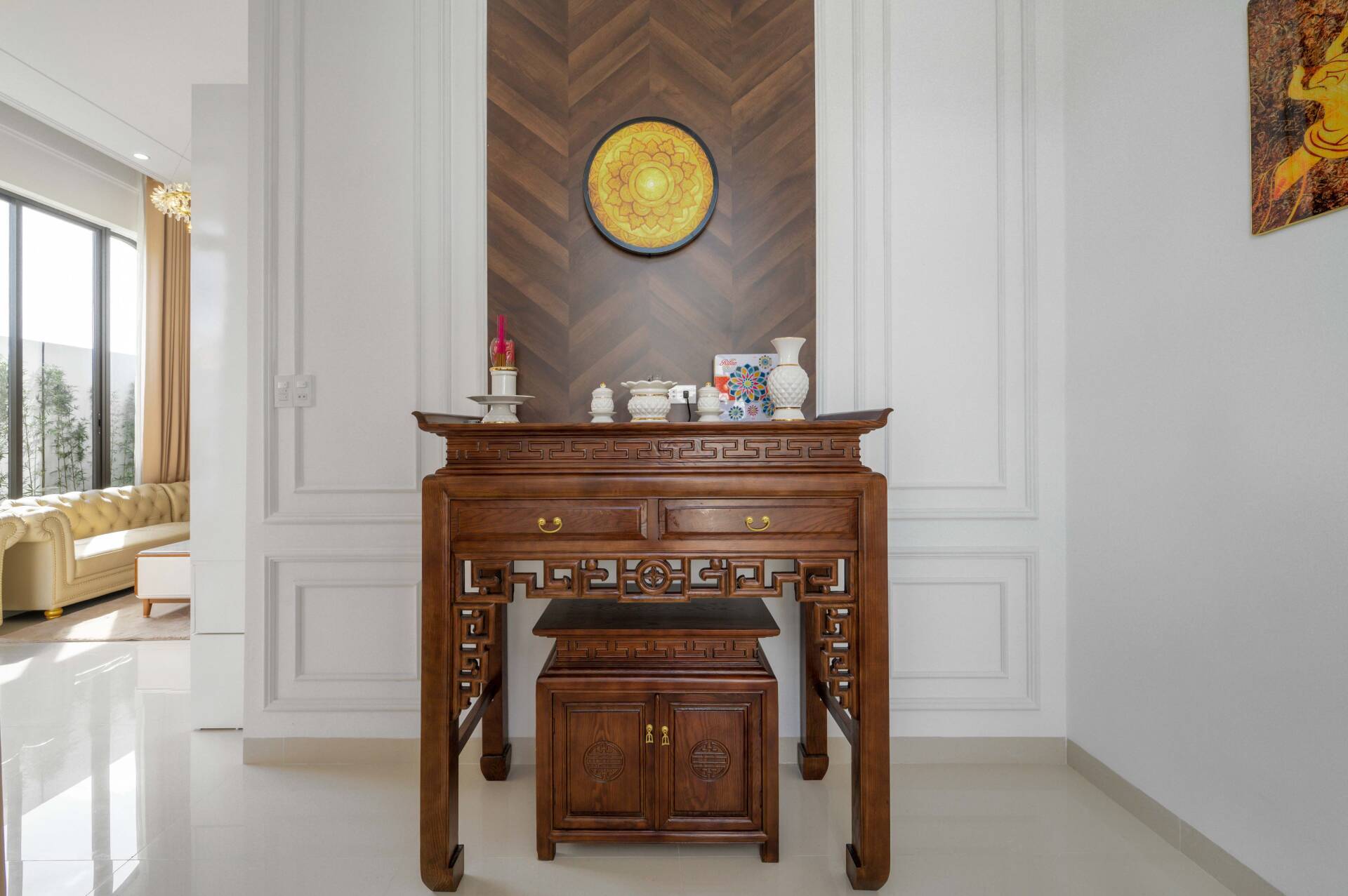 Gian thờ nhỏ gọn đặt cạnh phòng khách là phương án được nhiều gia đình lựa chọn (Ảnh: S House)