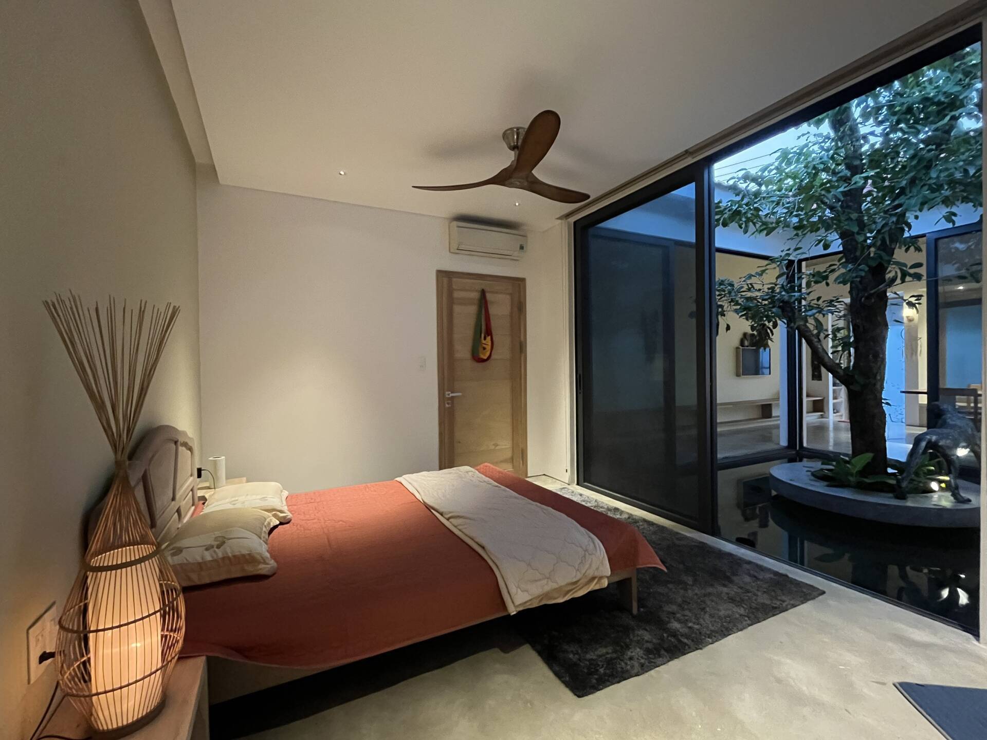 Thiết kế phòng ngủ nhà cấp 4 lắp đèn có ánh sáng dịu nhẹ, giữa phòng lắp quạt trần nhỏ, cuối phòng có cửa nhìn thẳng ra giếng trời (Ảnh: Vinh Home)